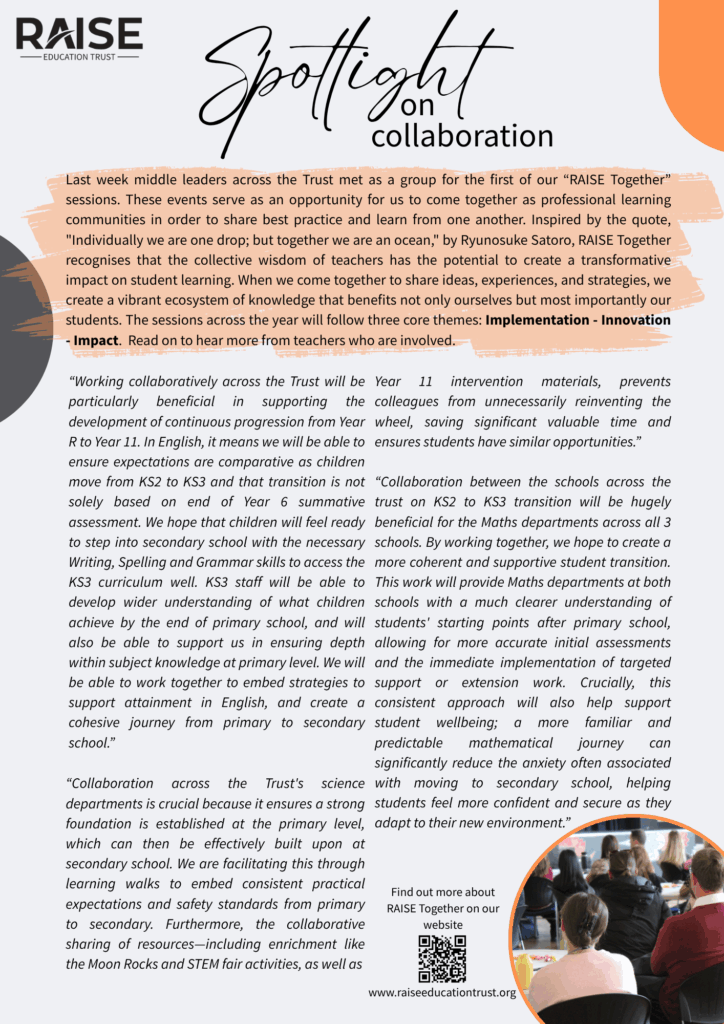 RAISE Spotlight is a valuable newsletter which distils key research updates and exemplary practices into an accessible format for all staff supporting a collaborative culture across the Trust.